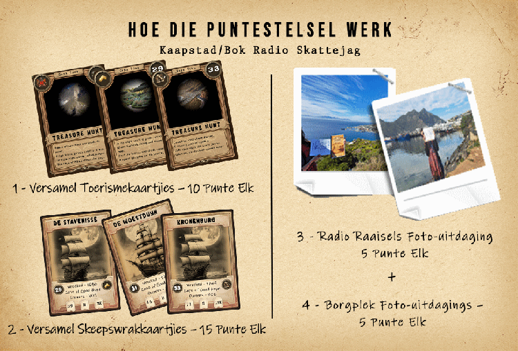 In die Kaapstad/Bok Radio Skattejag gaan dit nie net daaroor om eerste die skat te vind nie – jy kan ook punte verdien op die pad daarheen!